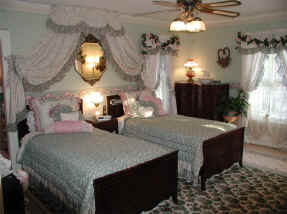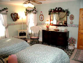 The Rose Room in the Mill House: The second floor Rose Room features two twin sleigh beds in a large cheery room. The room has a fireplace, AC and ceiling fan.